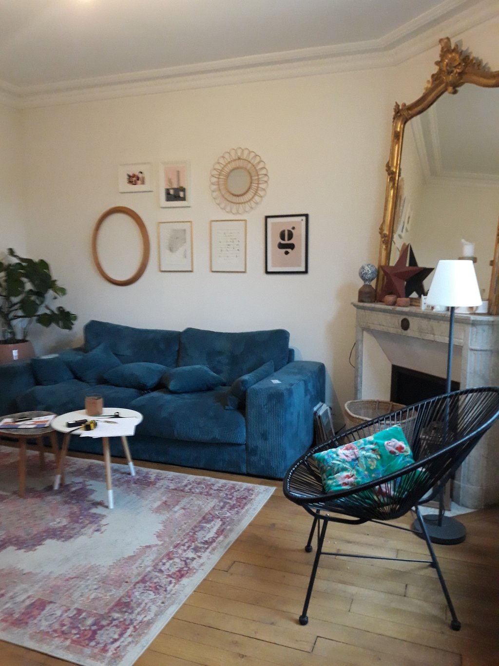 En optant pour un pan de mur de couleur, et en intégrant une table basse effet marbre, j’aspire à sublimer cette cheminée d’origine.